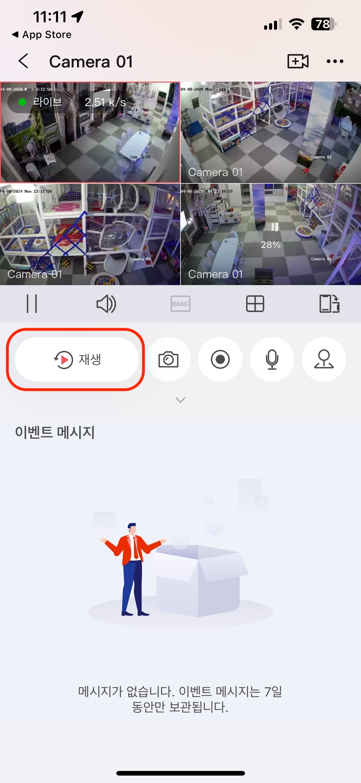 재생 버튼을 터치하여 녹화 영상 화면으로 진입